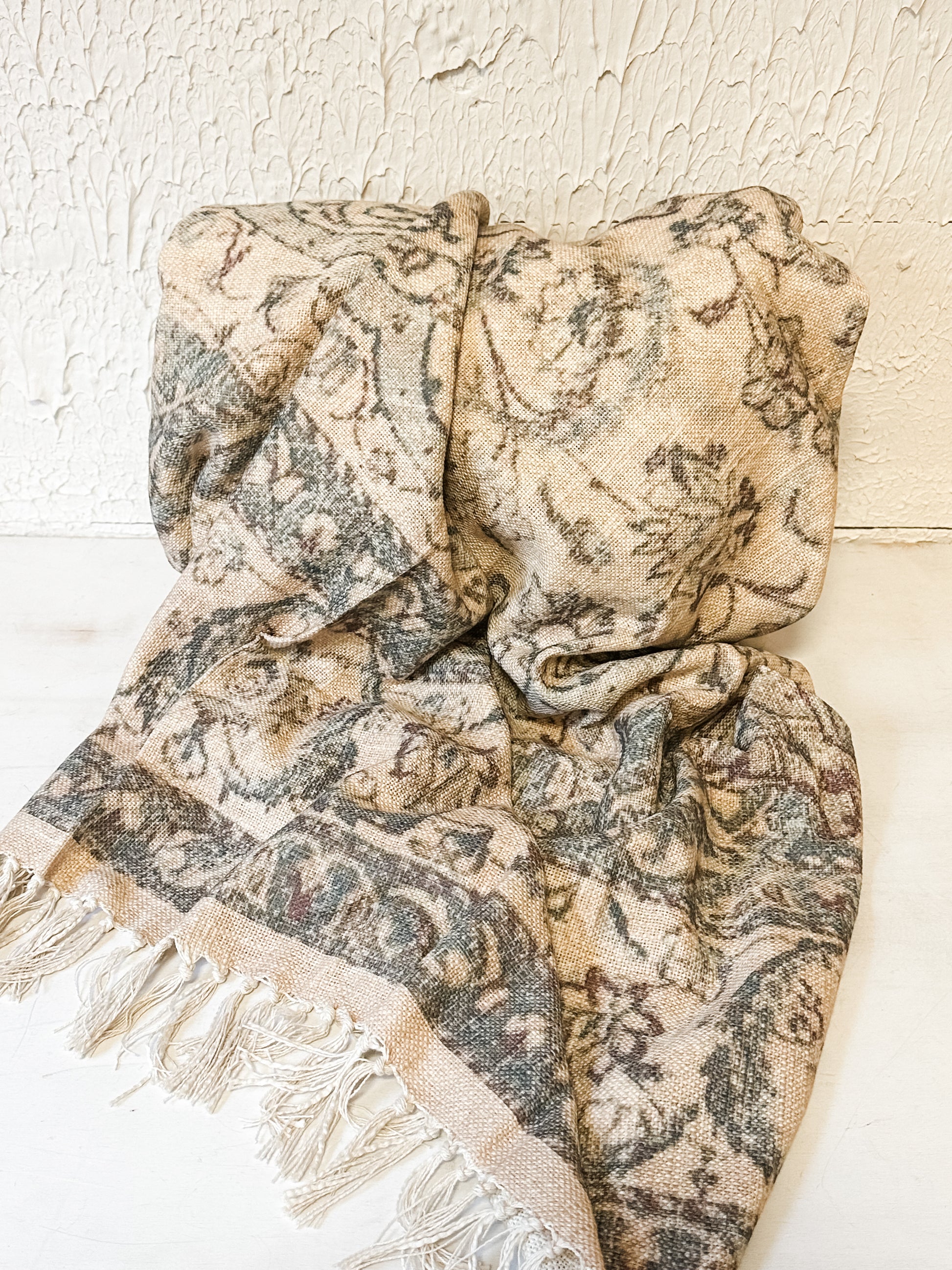 Bring vintage-inspired comfort to your space with our Antique Rug Slub Throw, beautifully woven in faded grey and cream tones. Measuring 50” W x 60” L, this 100% cotton throw features a soft, textured slub weave and an antique rug-style pattern that adds depth and timeworn charm to any setting.