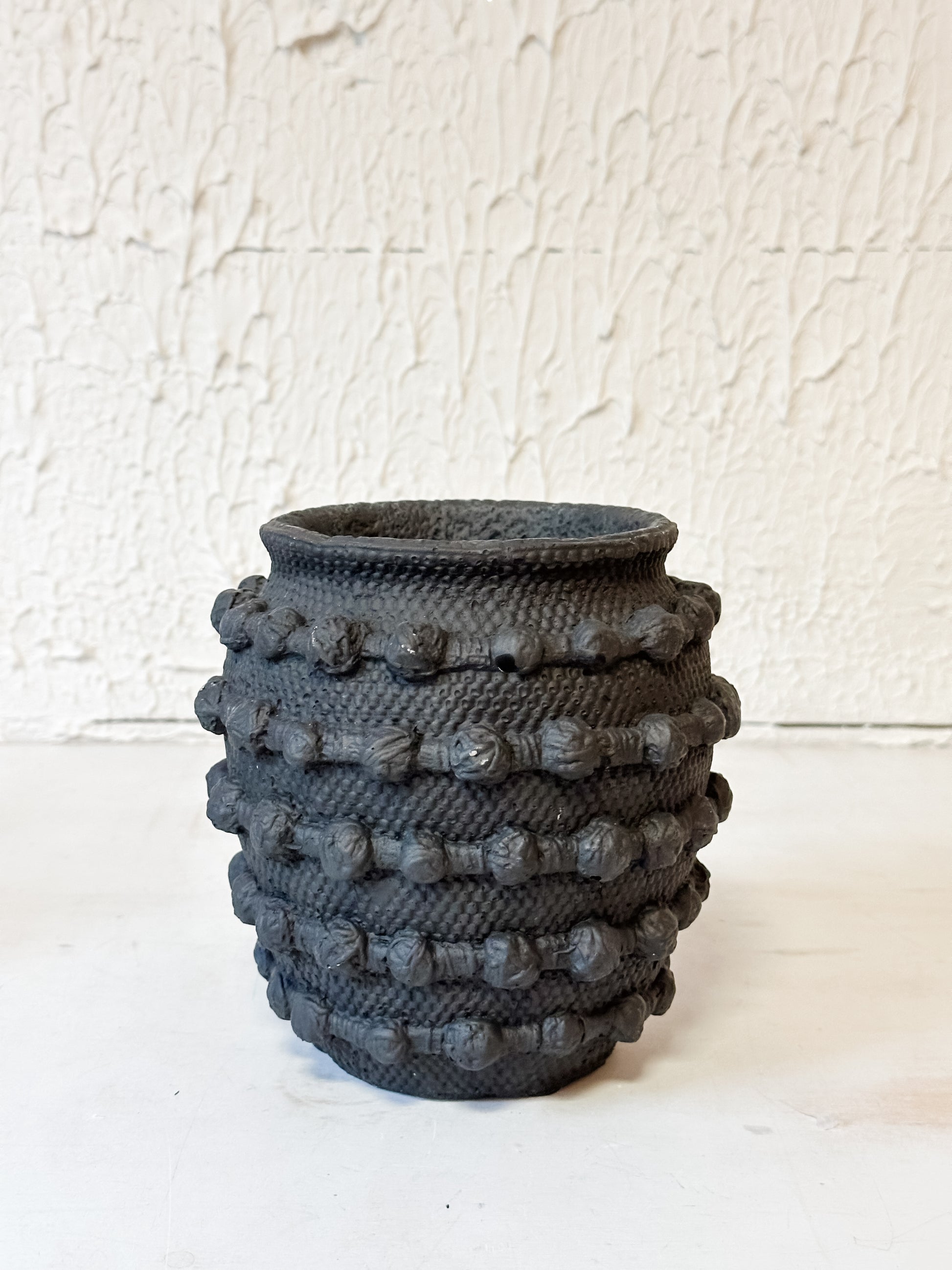 Elevate your home decor with our striking Black Textured Knot Cement Vase. Measuring 6.5" high by 4.5" wide, this unique vase combines contemporary style and organic charm, featuring a distinctive knotted texture in sophisticated matte black cement. Perfect as a standalone statement or styled with fresh or dried botanicals, it effortlessly adds depth and interest to your space.