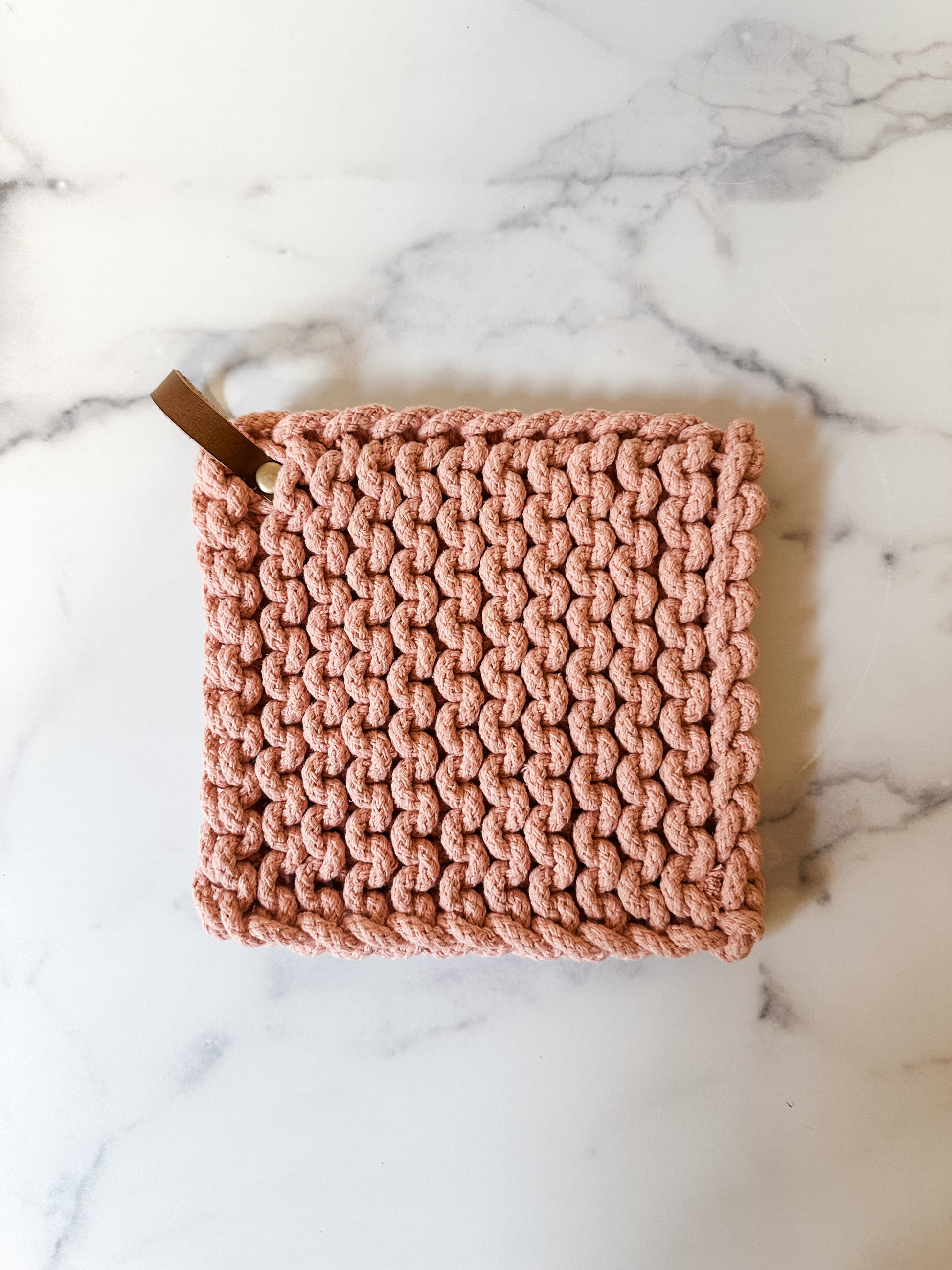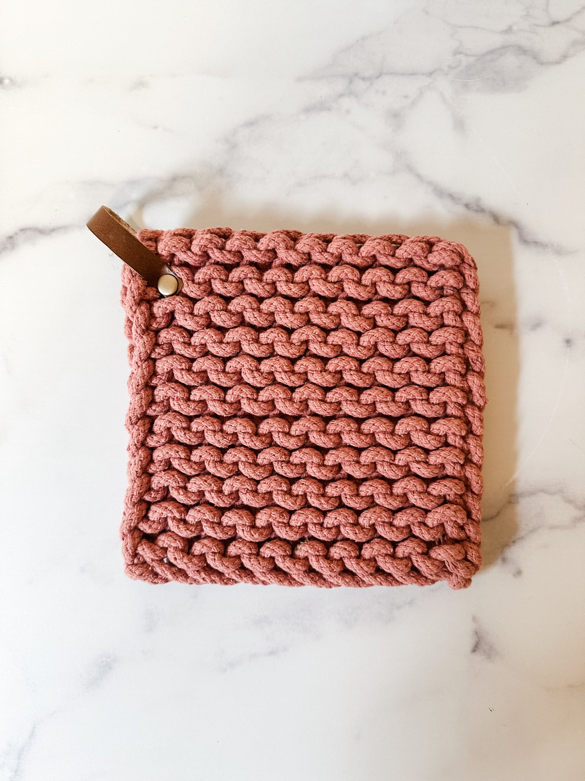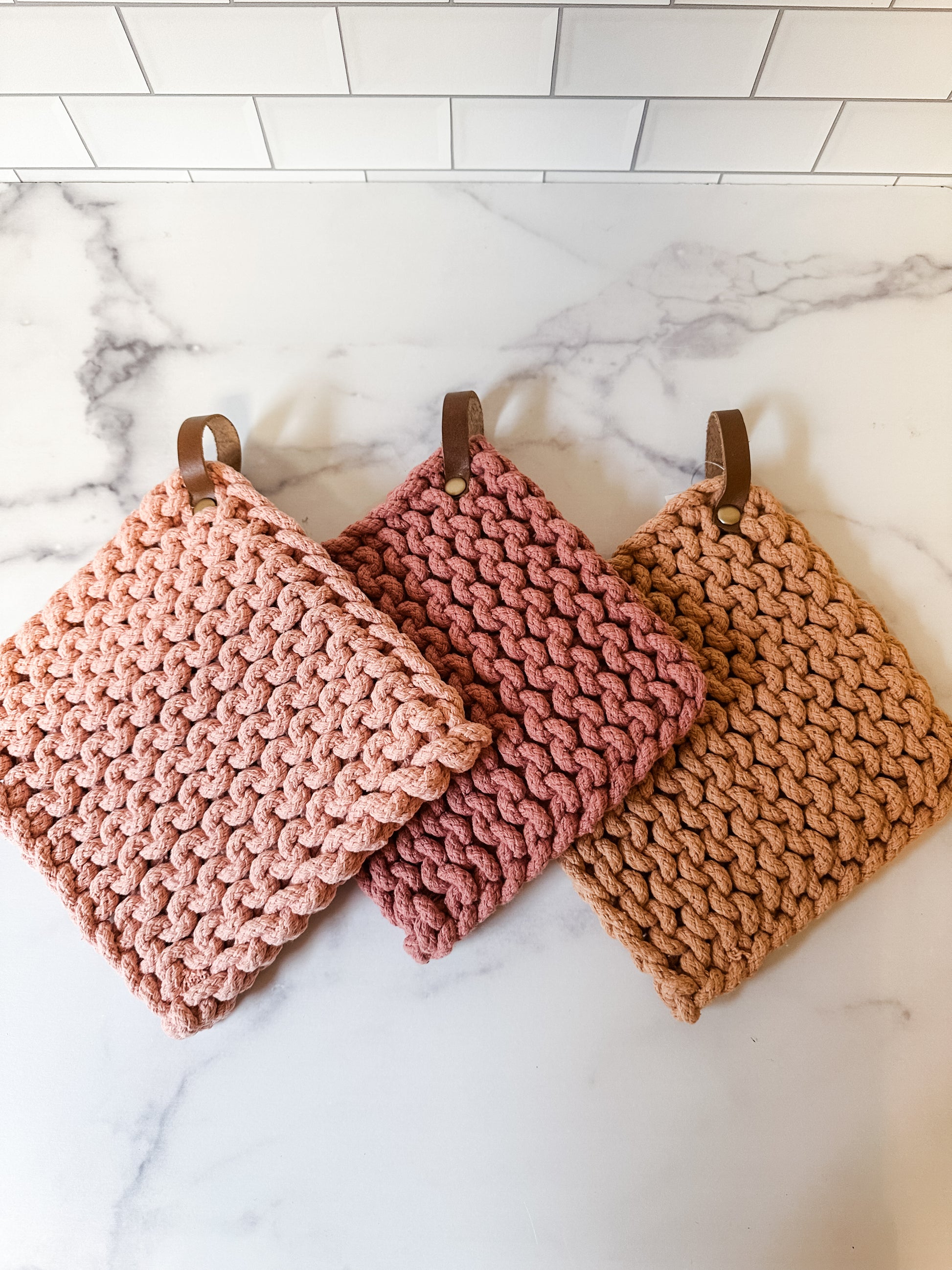 These 8" square cotton crocheted pot holders come in 4 colors and has a leather loop on it. Perfect for hanging decor in your farmhouse kitchen. These also make great house warming gifts.