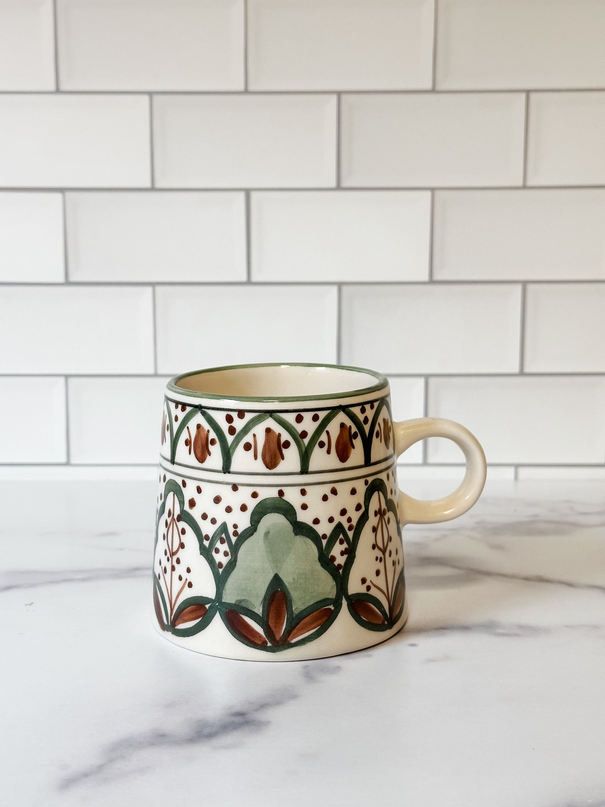 Start your day with warmth and charm using our hand-painted 10 oz. stoneware mug. Crafted for everyday use and styled with intention, each mug features a unique blend of cream, brown, and green tones, making no two exactly alike. Its 3-3/4" round shape offers the perfect balance of comfort and capacity—ideal for coffee, tea, or a cozy hot cocoa moment.