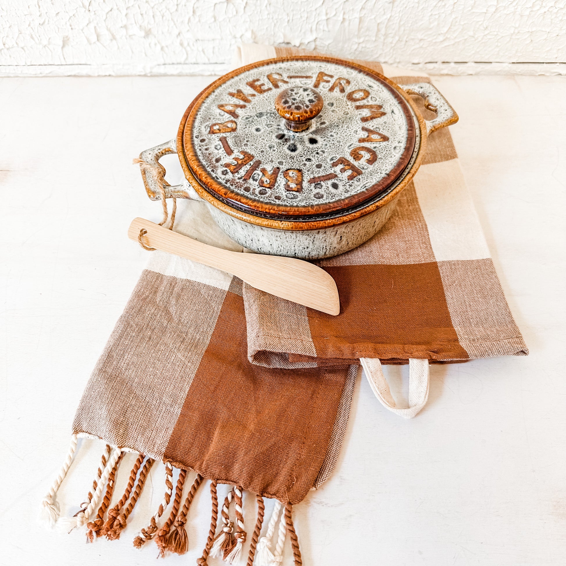 Make entertaining easy and elegant with this stoneware brie baker. Finished in a warm brown and tan reactive glaze, each piece has its own unique character. Perfect for baking and serving brie, dips, or spreads, this baker transitions beautifully from oven to table. It also makes a thoughtful housewarming or hostess gift.