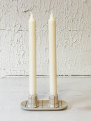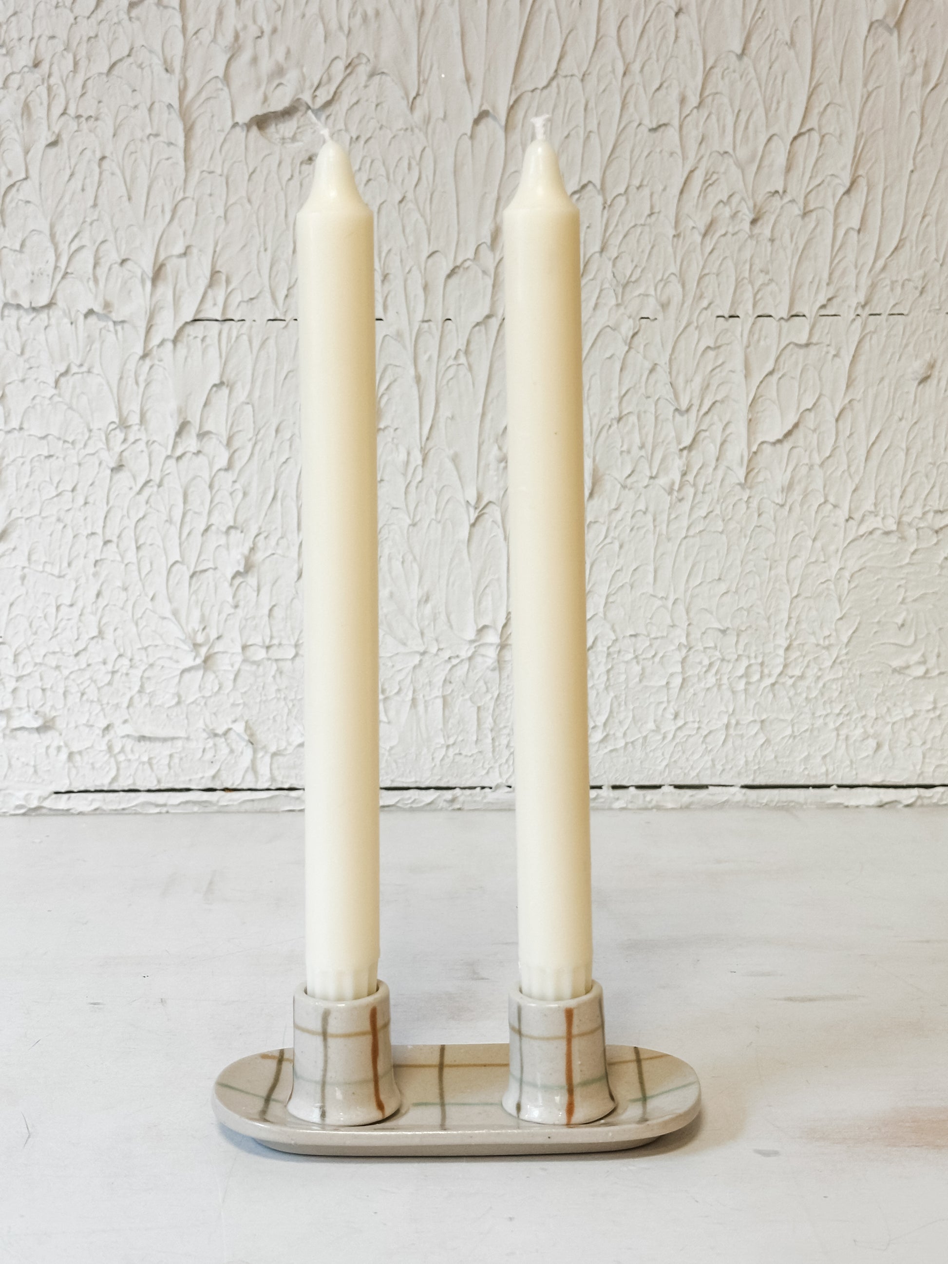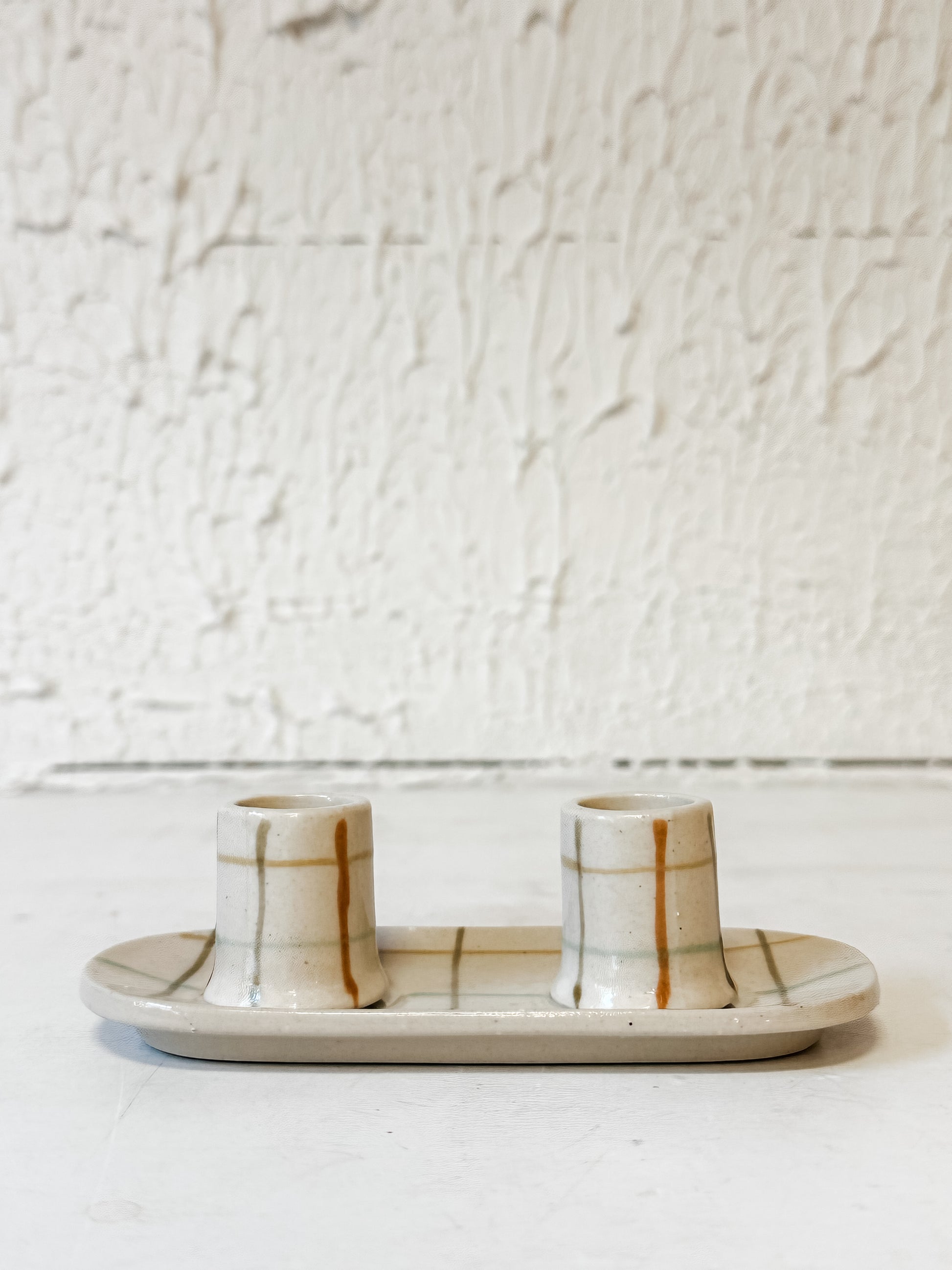 Add an artful touch to your table or mantel with this hand-painted stoneware double taper holder, featuring a unique grid pattern and a beautiful reactive crackle glaze. Each piece showcases subtle color variations and painterly detail, making every one truly one-of-a-kind. Designed to hold two taper candles, it’s a perfect way to bring warmth and personality to your holiday tablescape or everyday décor.