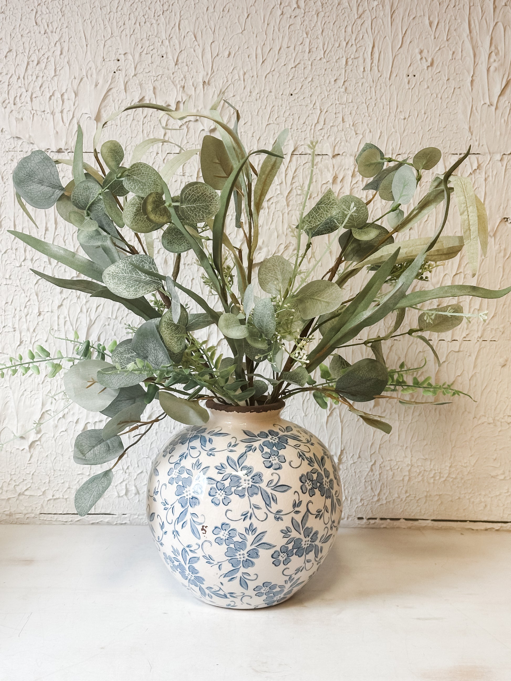 This terracotta vase blends timeless craftsmanship with vintage charm. The blue and white transferware-style pattern adds a classic, collected look, while the antique finish gives it a soft, aged character that feels right at home in farmhouse, cottage, or traditional spaces.